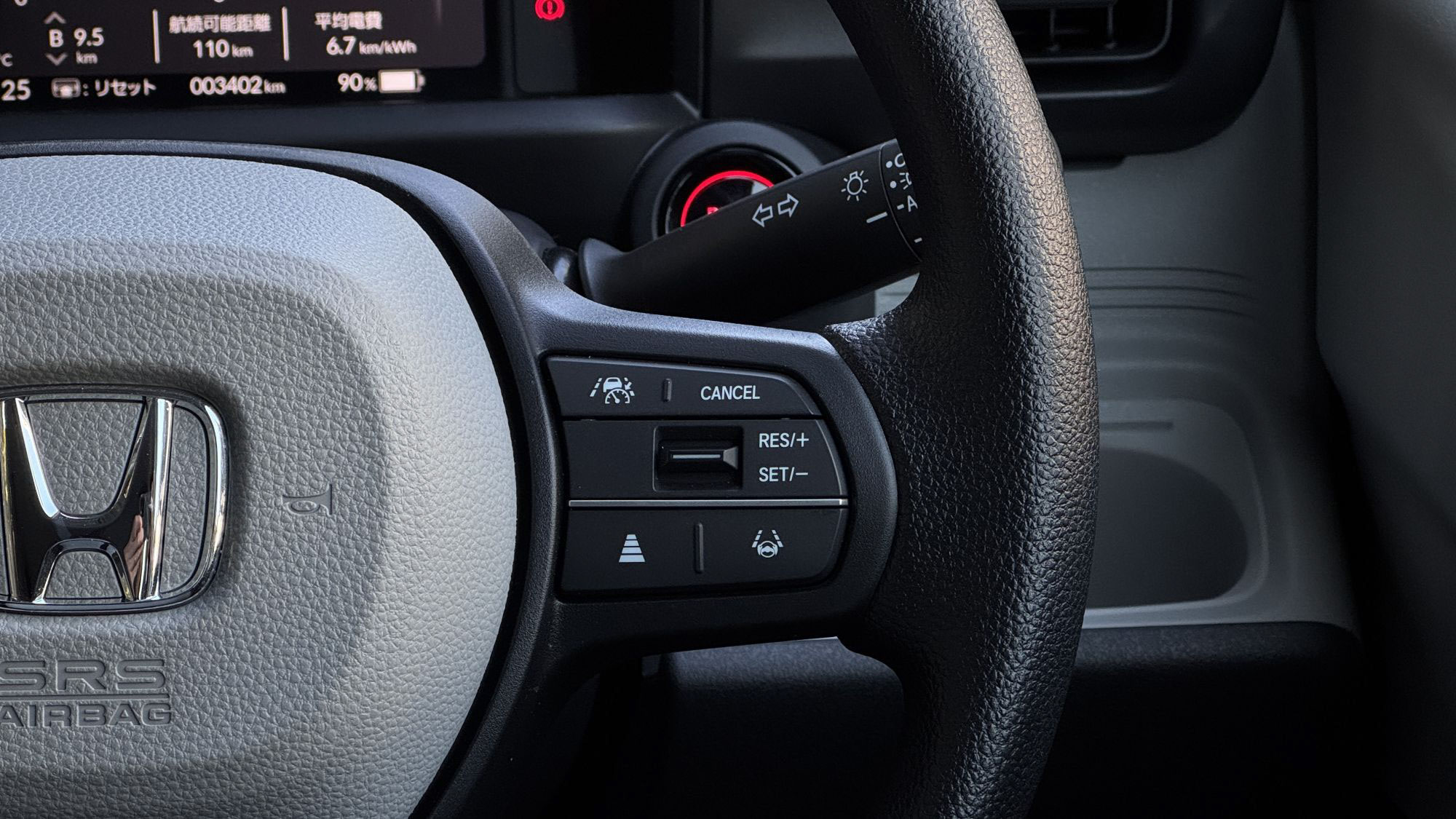 N-ONE e:のACCはステアリングホイール右スポークのスイッチで操作します。設定速度は1クリックで1km/h、長押しで10km/hごとに変わります。ただしACC速度設定上限は115km/hまで(N-VAN e:やサクラと同じ)なので、120km/h巡航時はアクセルペダルを操作する必要があります。先行車との車間距離設定は左下のスイッチで4段階から選択可能です。