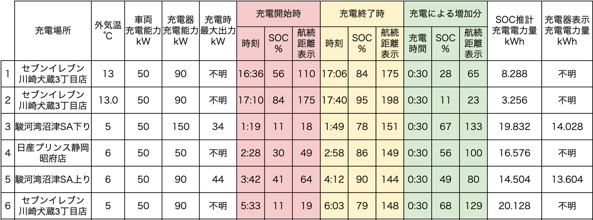 ※「充電器表示充電電力量」は充電器に表示、もしくはアプリなどに通知された電力量。表示がない場合は不明としています。