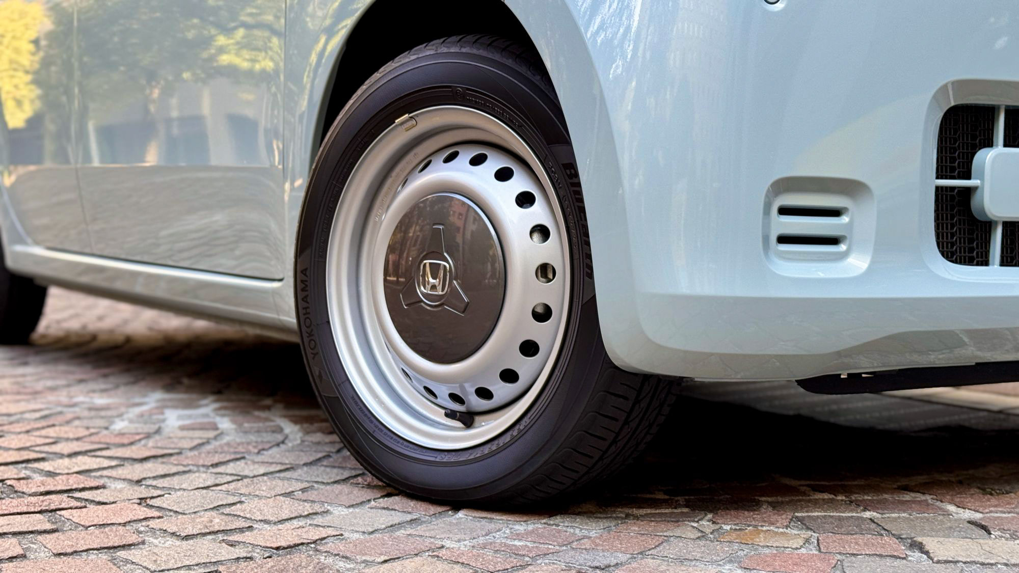 N-ONE e:のタイヤサイズは前後ともに155/65R14で、メーカーはヨコハマ、商品名はブルーアースFC8V(ホンダとの共同開発品)でした。さほど静粛性にこだわったタイヤではないように感じました。エンジン音のない静かなEVのメリットを活かすためにも、私なら同じヨコハマブランドであれば、ADVAN dB V553への交換を検討したいと思います。