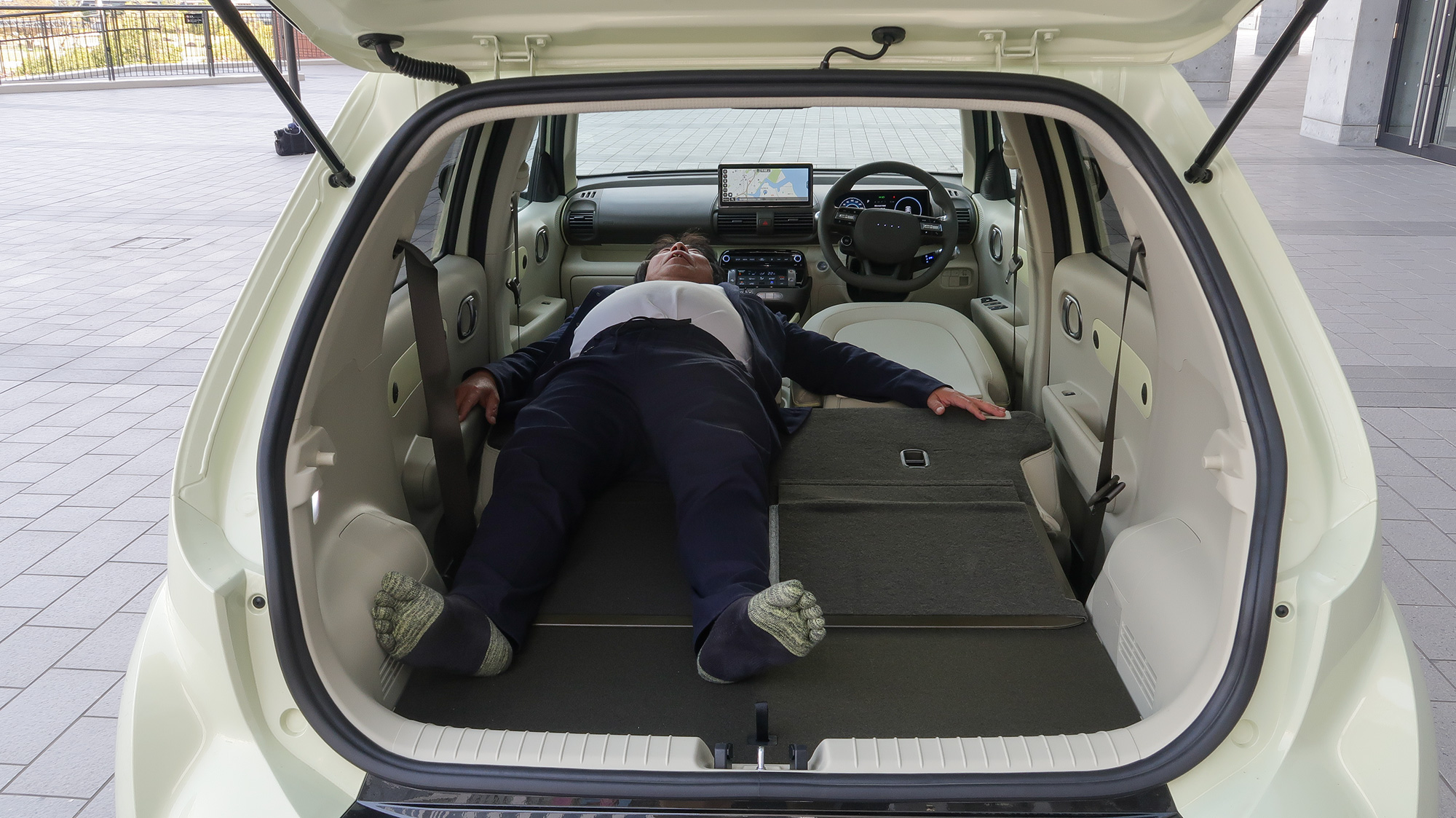 運転席や助手席までフルフラットにフォールディング(折りたたみ)できるのもインスターのセールスポイント。試しに寝っ転がってみると、車中泊も快適に過ごせそうってことを実感できました。