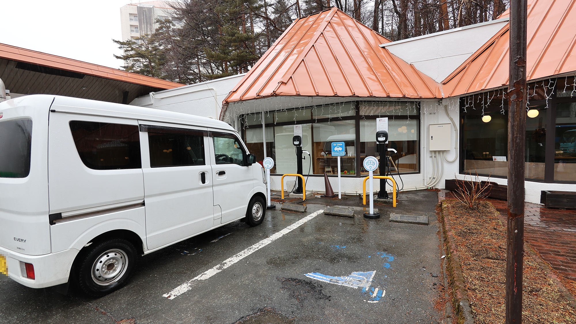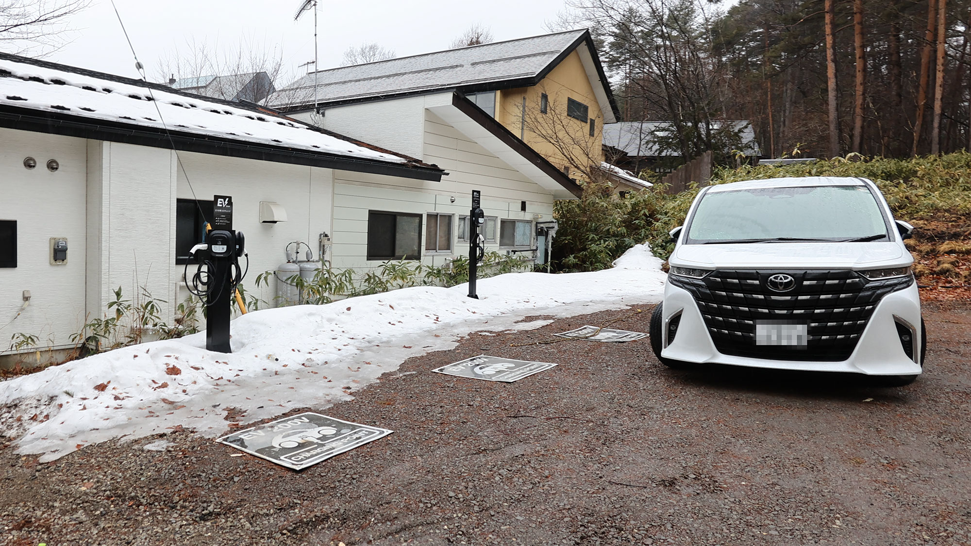 湯音の森駐車場の6kW充電器。せっかくの4口ですが、多摩ナンバーのアルファードが謎の駐車姿勢で2区画をふさいでいました。