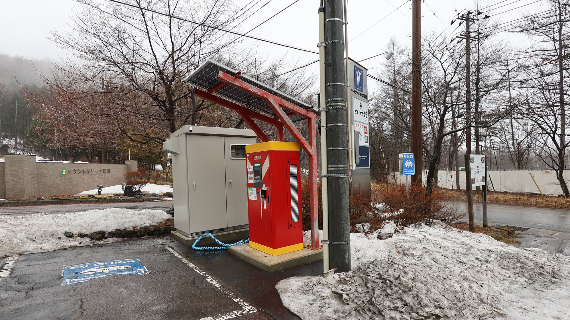 雪道を求めて徘徊中には、志賀草津道路に続く温泉街外周路沿いの商業施設駐車場にフラッシュの超急速充電器が新設されていることに気付きました。出力は最大180kW。今まで、草津温泉周辺では道の駅草津運動茶屋公園に50kW器があるだけだったので、日帰りのスキーなどに訪れて、「高性能EVで急いで充電したい!」という方には便利なスポットとなるでしょう。
