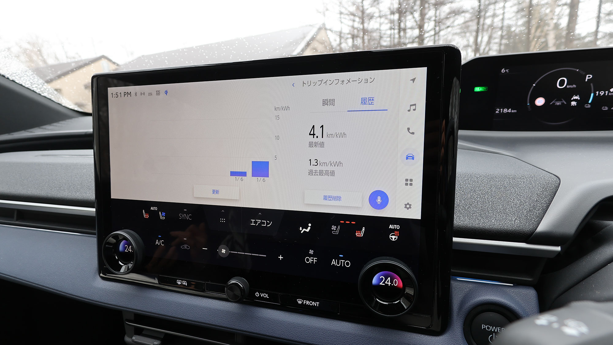 上に示したトリップインフォメーションが表示している電費は、おそらく伊香保温泉近くで水沢うどんを食べてから草津まで、けっこうな上り区間の数値だと思います。任意の区間の電費実績などを確認する方法は……、一泊二日の試乗ではよくわかりませんでした。