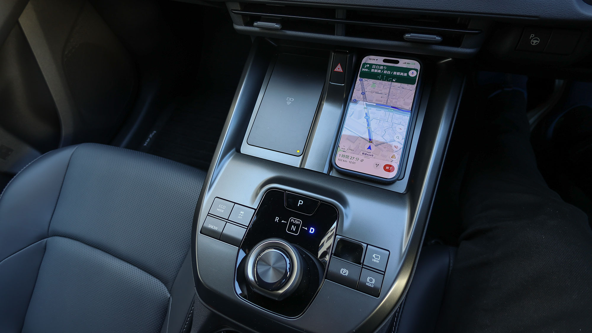 セレクターやホールドボタンなどがあるセンターコンソールまわりのデザインも一新されていました。運転席&助手席用が用意された非接触充電トレーに、スマホを置いた時の視認性がいいところは、地味だけど、個人的に「いいね!」と感じたポイントです。たとえば、テスラ車は早くからこんな感じになっています。あえて「見えない」配置にしている車種があるのは、運転中にスマホを注視しないようにということなのでしょうが、正直言って不便です。