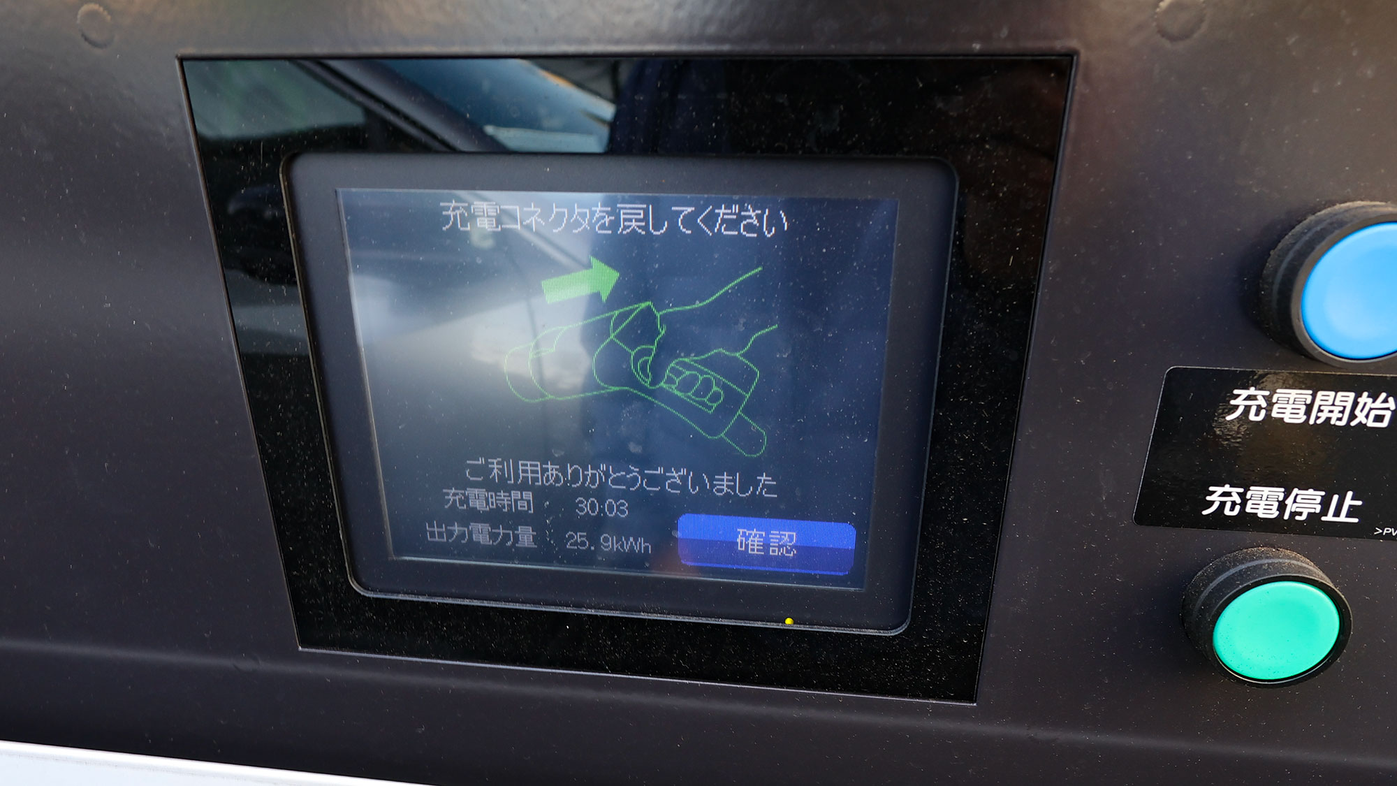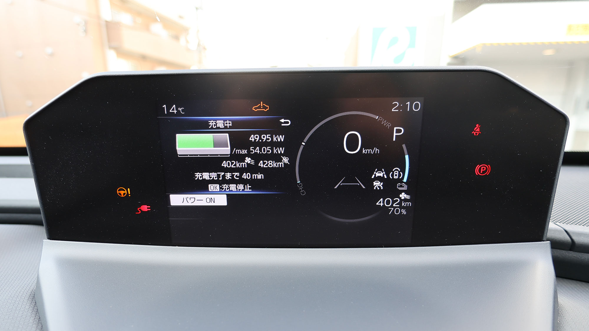 新型bZ4Xの急速充電性能は最大150kW(350A)とアナウンスされています。でも、それはSOCが10〜20%など低い場合に叩き出される数値であって、今回は60%からの充電開始。スタートしてから30分、ずっと50kW程度の充電が継続しました。SOCが80%を超えてもそれほど出力は低下せず、30分間の充電電力量は25.9kWhという結果でした。