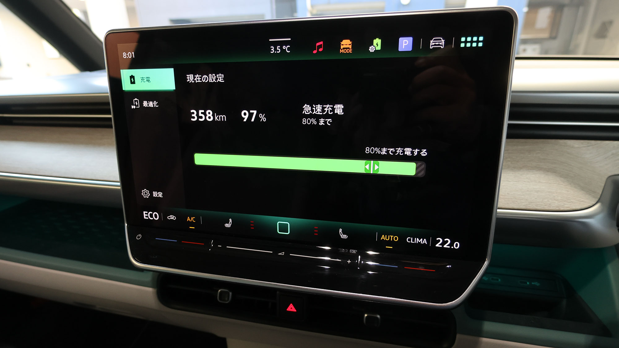 さて、Audi Charging Station 厚木にはSOC13%で到着。ギリギリじゃないかと感じる方がいるかも知れませんが、そこは大容量EV。航続可能距離表示はまだ58kmもあるので、まったくドキドキすることはありません。