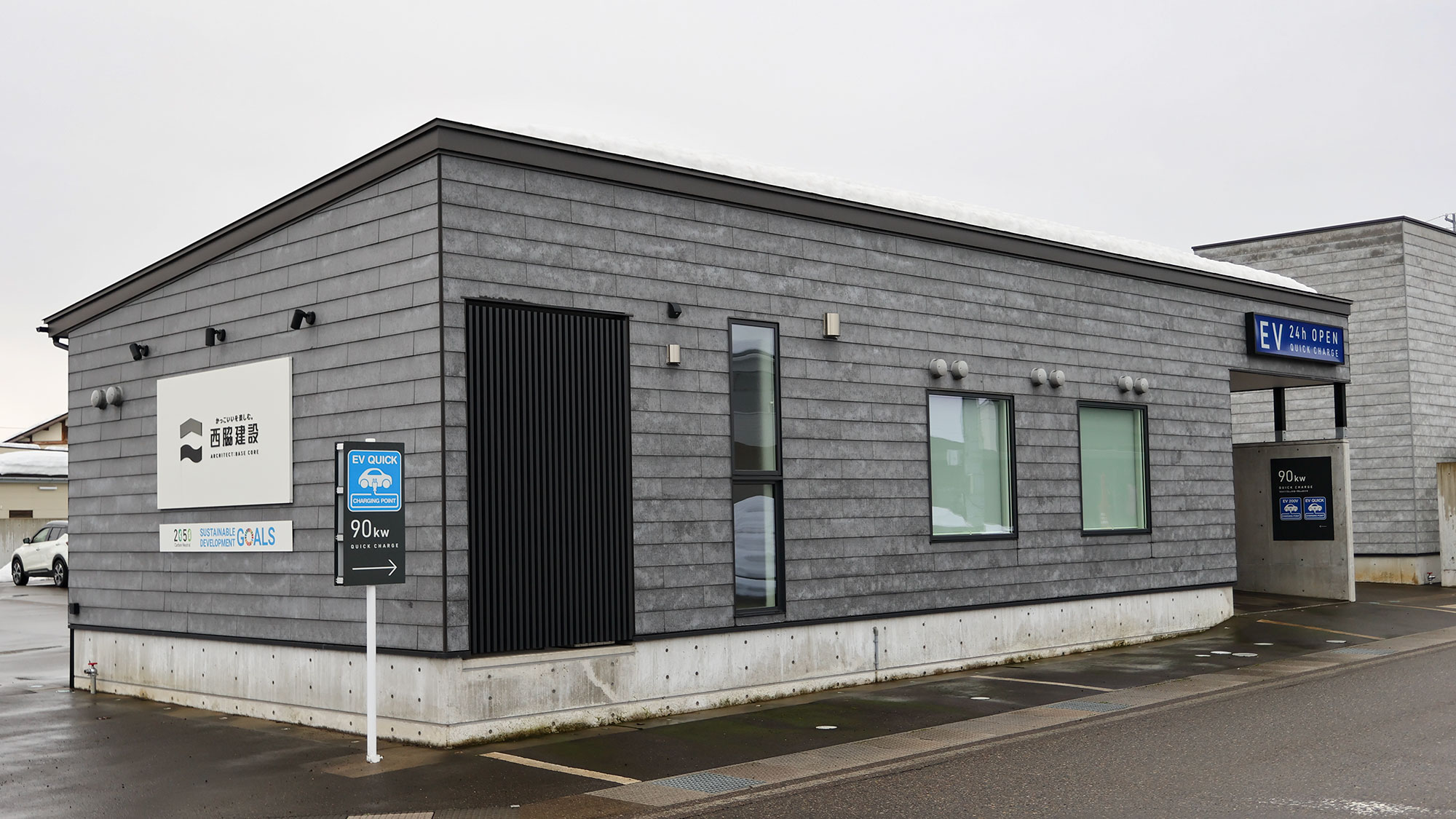 ところが、アプリで「西脇建設」と表示されていたこのステーションにびっくり仰天。まるでアウディの「チャージングハブ」と見まごうような屋根付きの立派な場所に、新電元の90kW器が設置されていました。思わず母屋に飛び込んで社長にお話を聞くことができたので、そのあたりは改めて別記事で紹介したいと思っています。ともあれ、SOC11%からの充電は開始直後から90kW器の最大となる200Aを記録。30分間で69%まで、40kWh以上を充電することができ、EX30の充電性能が優れていることを確認できました。
