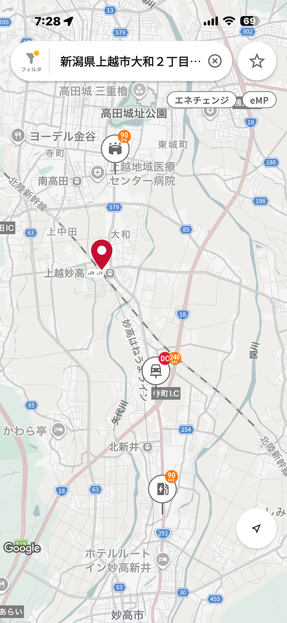 最終目的地である上越妙高駅までの距離は、Googleマップで検索すると関越自動車道経由で「298km」、中央自動車道経由で「353km」です。昨年の復路では中央道談合坂SAに新設された150kWの急速充電器を試すため、あえて遠回りの中央道ルートを選択しましたが、今回は関越道ルートをチョイス。途中でスキー場(雪道目当て!)に寄り道しても十分に完走可能。せっかくなので、上越市内の高出力急速充電器で急速充電を試してみようという計画にしました。